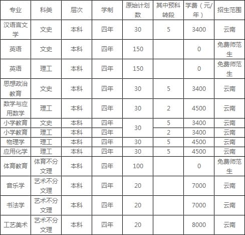 第十二条 体育、音乐、美术教育专业须参加考生所在省(市、区)组织的专业统一考试。艺术类书法学专业需参加云南艺术学院组织的专业考试,我校认可其成绩。体育教育专业优先录取女生,音乐、英语教育专业优先录取男生,其他专业男女生比例不限。